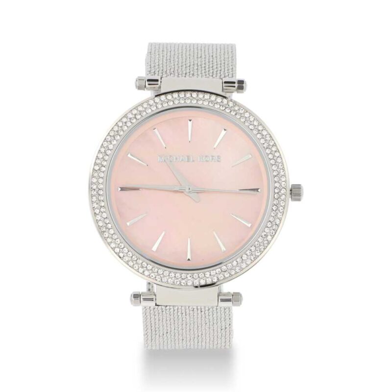 - Esfera: Color blanco o plateado con logo MK y indicadores simples en oro rosa.