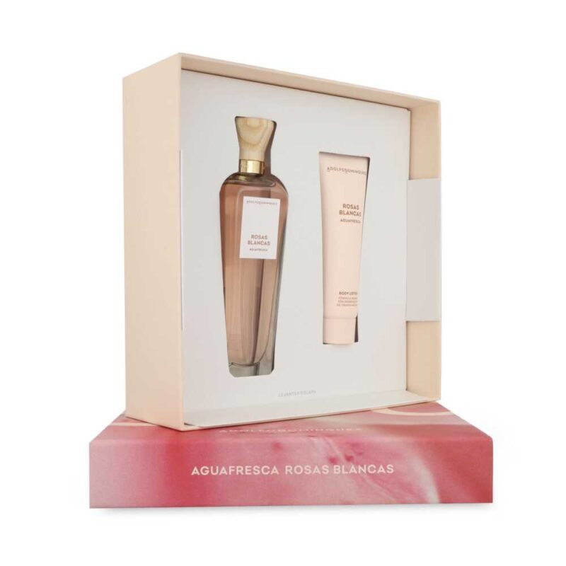 Este set de ADOLFO DOMINGUEZ presenta Agua Fresca de Rosas Blancas. Es un Eau de Toilette Chipre Floral, una interpretación moderna y más luminosa del clásico Agua Fresca de Rosas.