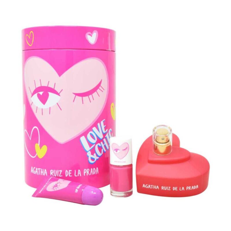 Este set de AGATHA RUIZ DE LA PRADA es pura diversión y amor. Incluye la fragancia Love Love Love, un aroma Floral Frutal juvenil y romántico, junto con cosméticos a juego.
